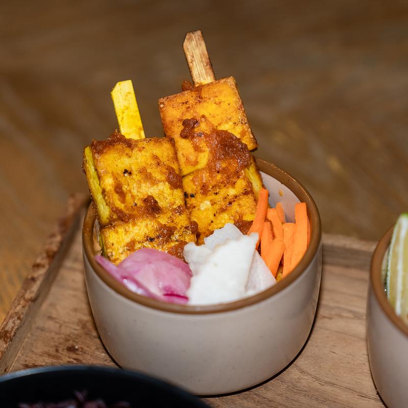 5 pcs seared tofu skewers | served with homemade peanut sauce | Pickles
